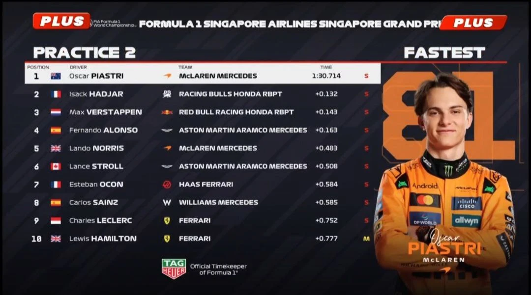 🇸🇬 Результаты второй тренировки Гран-при Сингапура 2025