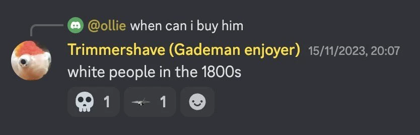 Далее последовала расисткая шутка о белых людях в 1800х годах, на которую Олли никак не отреагировал.