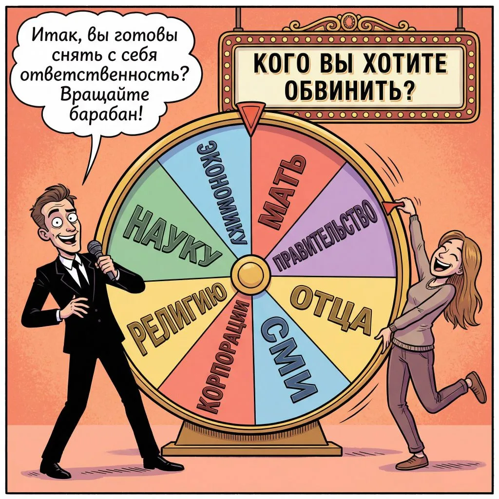🔥 Лайфхак: чтобы не отвечать за свою жизнь, просто найдите подходящего „виноватого“. Родители, школа, правительство, фаза Луны, ретроградный Меркурий — выбор огромный.