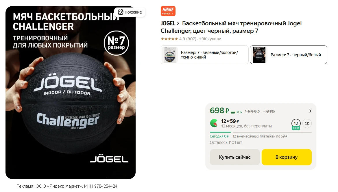 💻 Баскетбольный мяч тренировочный Jogel Challenger, цвет черный, размер 7