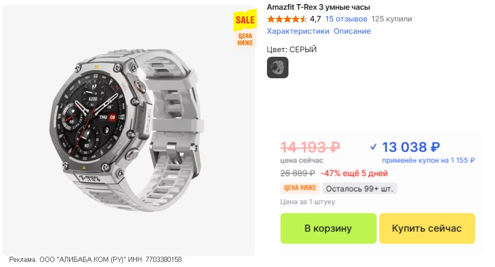 🚨Рекорд цены • Смарт часы Amazfit T-Rex 3 в сером цвете еще на 1.000 дешевле