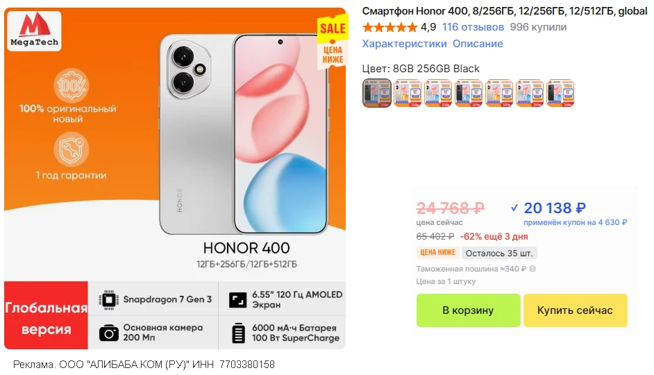 🛒 Honor 400 • 8/256 • глобальная версия