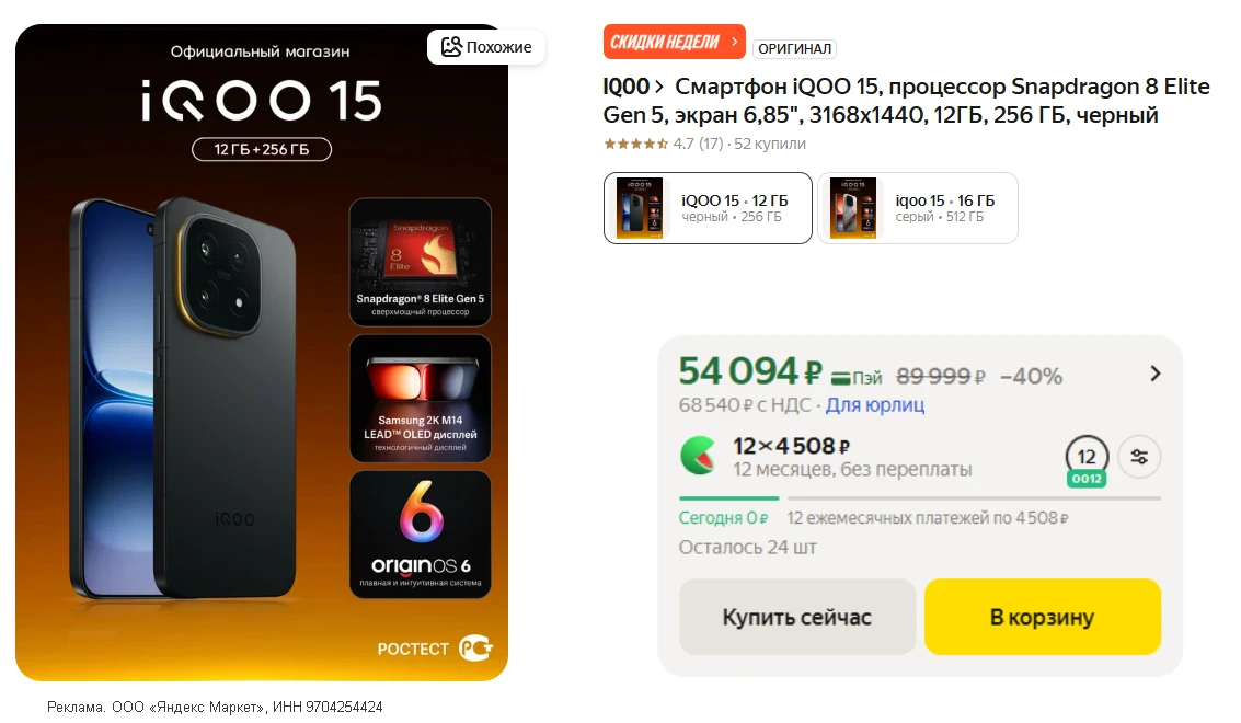 💻 Классная цена на флагманский iQOO 15 (Ростест) от официального магазина с доставкой завтра • долго цена не продержится - это 100%