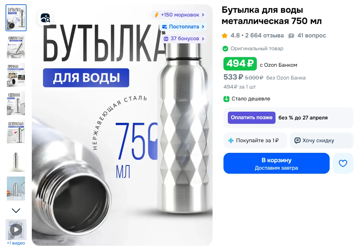 Бутылка для воды металлическая 750 мл за 494₽ с Ozon Банком - https://ozon.ru/t/R97myjI