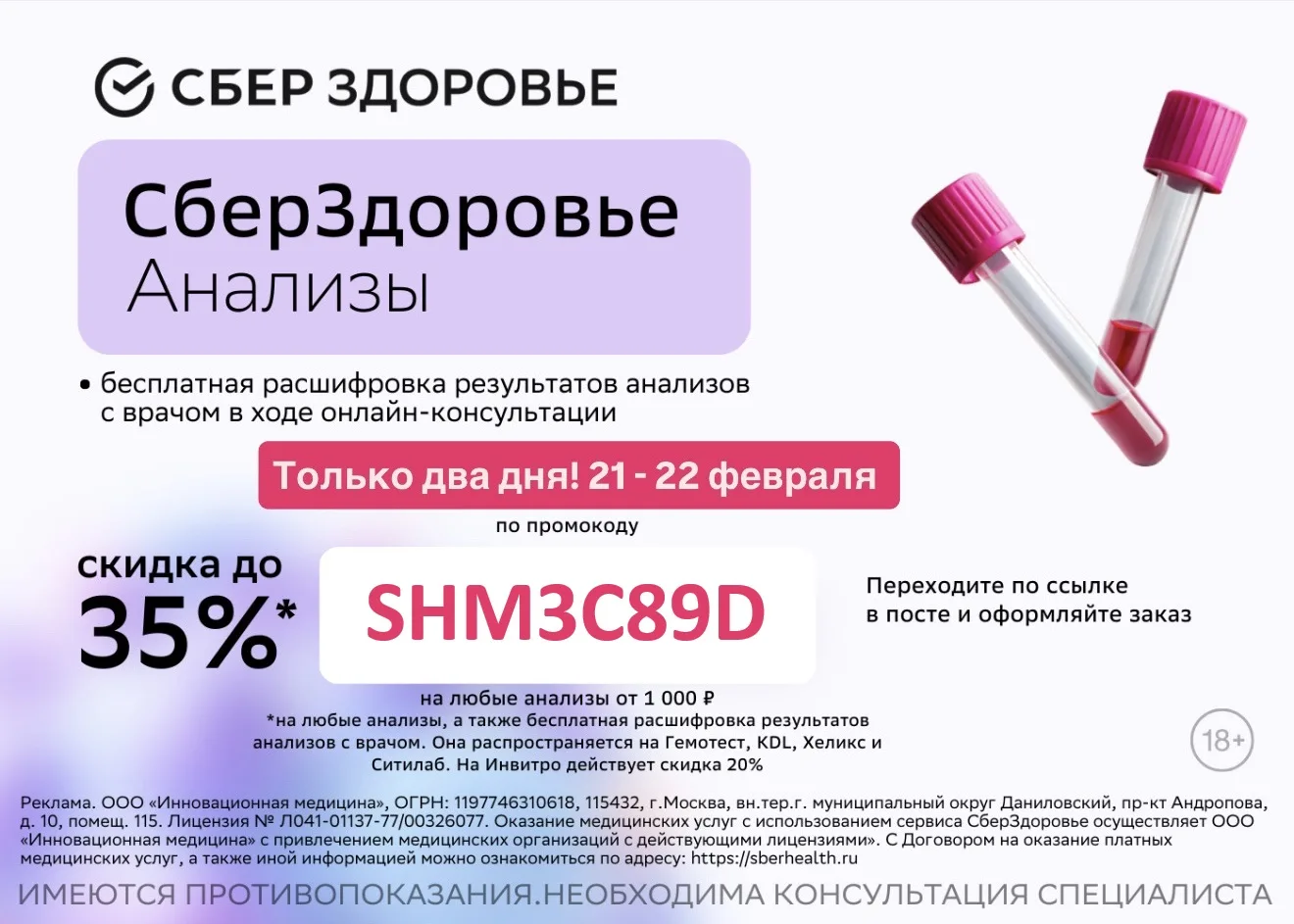 • И по промокоду SHM3C89D получайте скидку 35% на любые анализы, а также бесплатная расшифровка результатов с врачом.