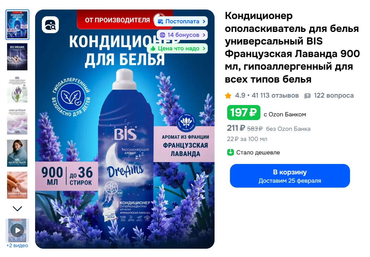 Кондиционер ополаскиватель для белья универсальный BIS Французская Лаванда 900 мл за 197₽ с Ozon Банком - https://ozon.ru/t/wGvWu5D