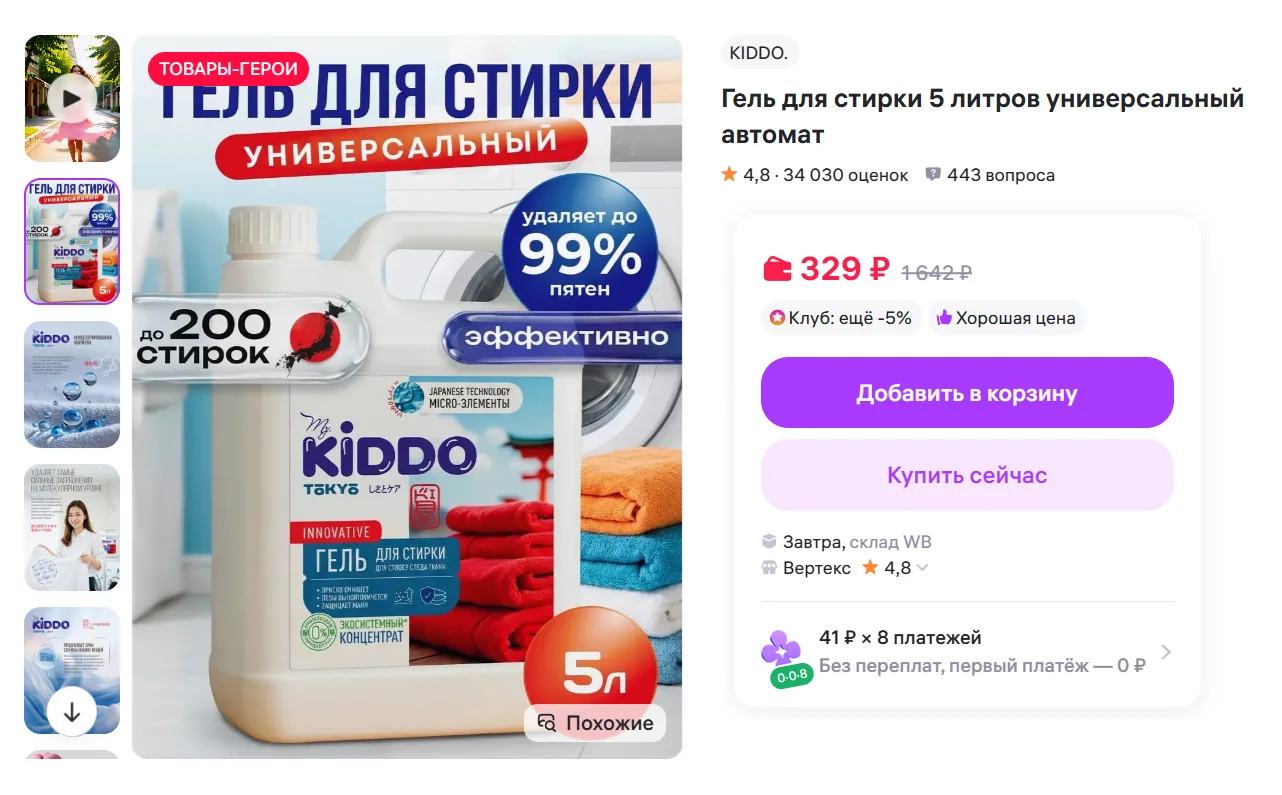 Гель для стирки KIDDO 5 литров универсальный автомат за 329₽ - https://www.wildberries.ru/catalog/370532849/detail.aspx