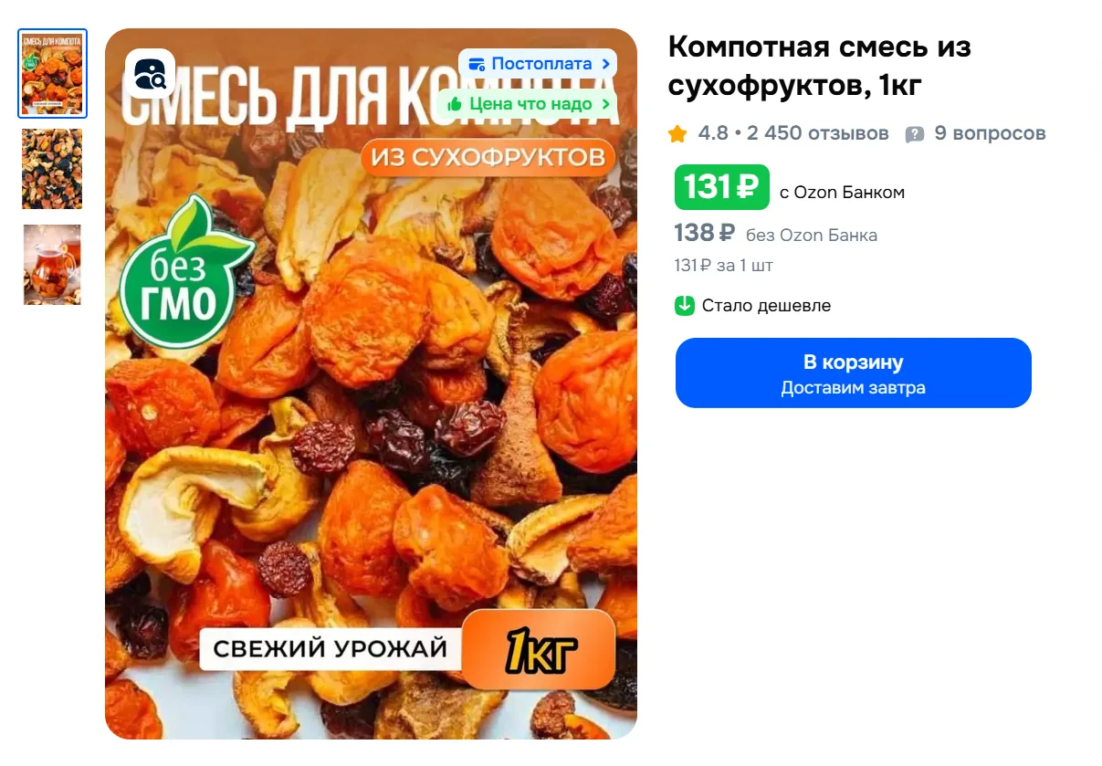 Компотная смесь из сухофруктов, 1кг за 131₽ с Ozon Банком - https://ozon.ru/t/R976mLT