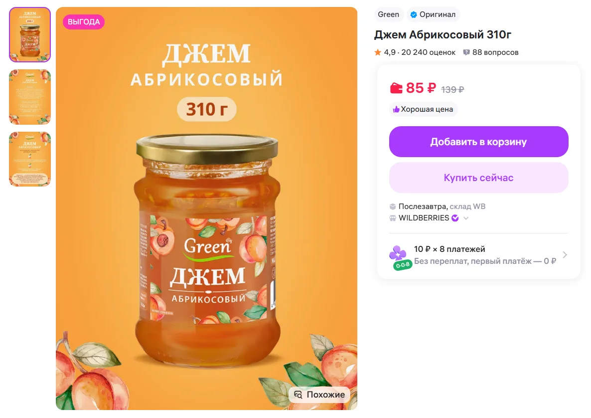 Джем Абрикосовый Green Ray 310г за 85₽ - https://www.wildberries.ru/catalog/187221668/detail.aspx