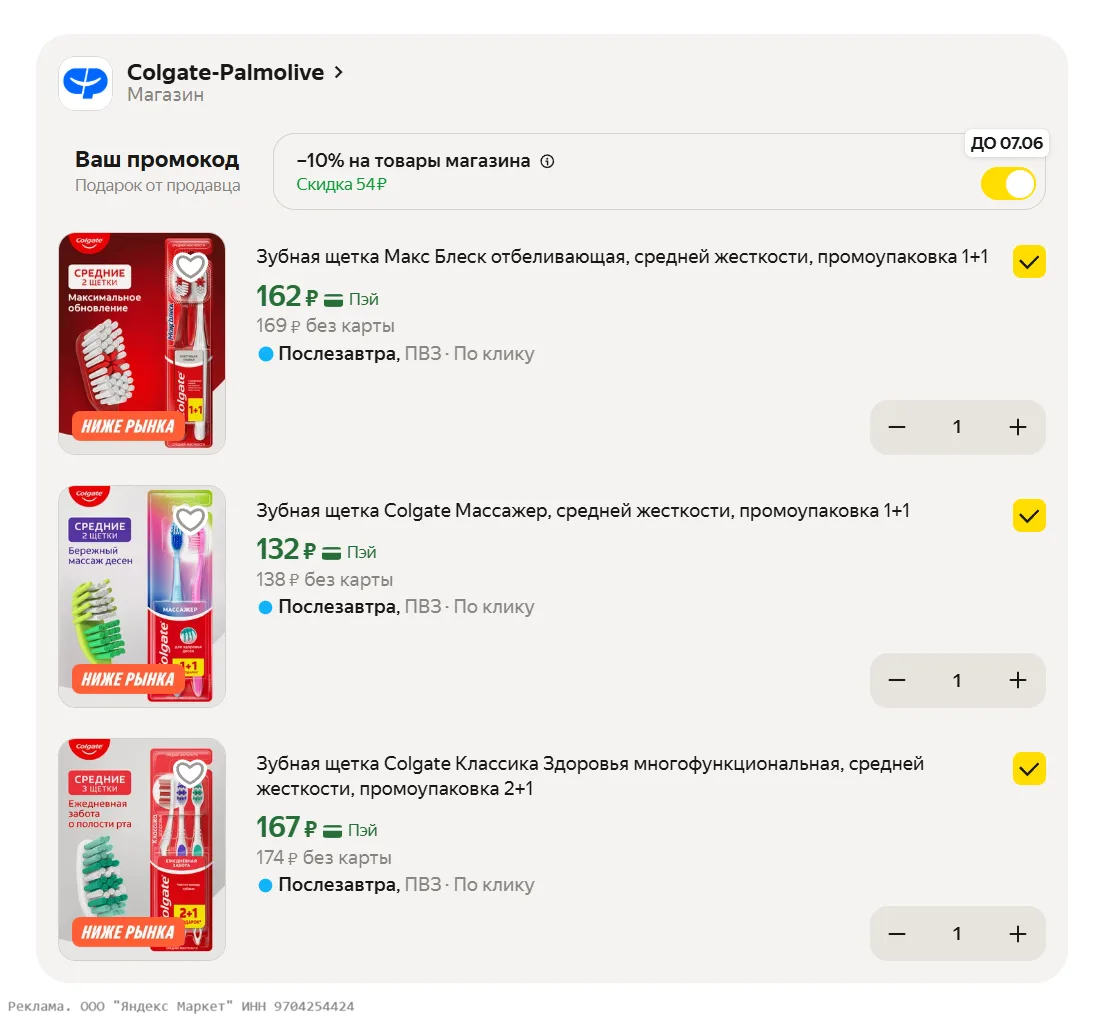 WELCOME2CP10 - https://shp.pub/7bp5sg?erid=2SDnjdhGLEM - доп скидка 10% на Elmex , Colgate, Palmolive и т.д.