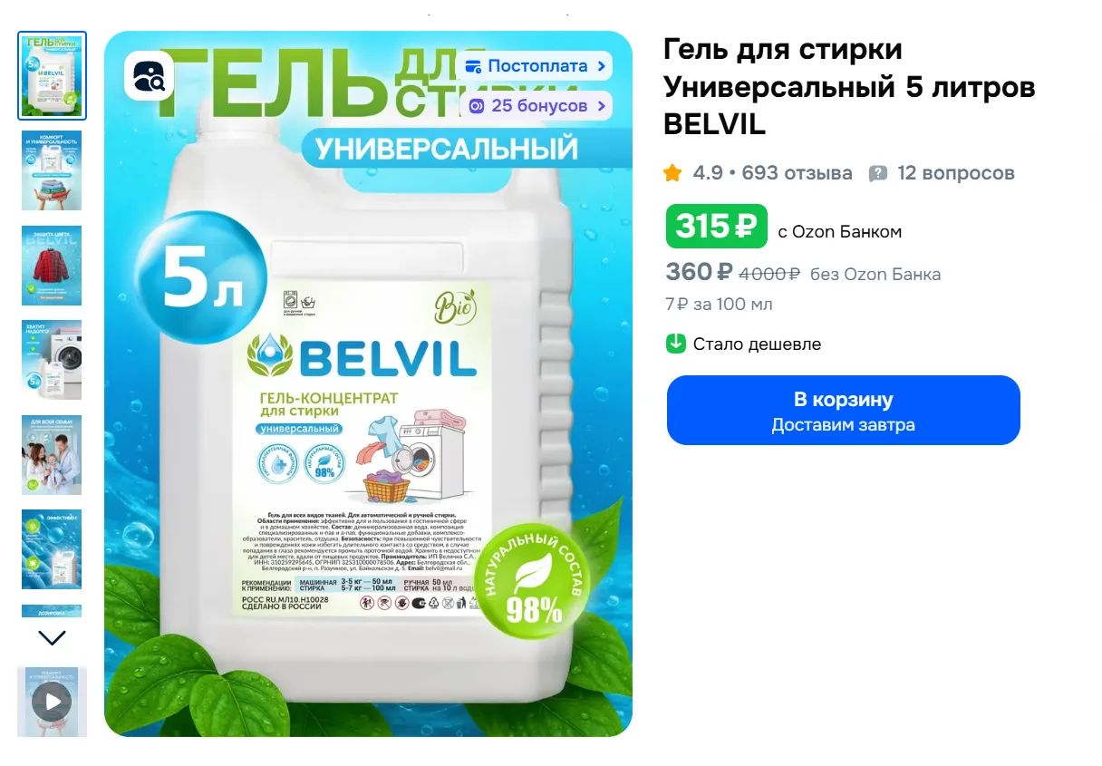 Гель для стирки Универсальный 5 литров BELVIL за 315₽ с Ozon Банком - https://ozon.ru/t/wGNkZCl