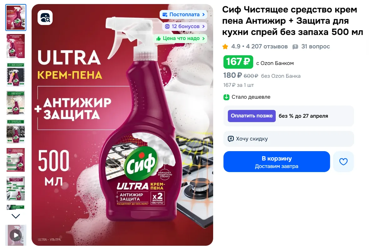 Сиф Чистящее средство крем пена Антижир + Защита для кухни спрей без запаха 500 мл за 167₽ с Ozon Банком - https://ozon.ru/t/AFS9wDg