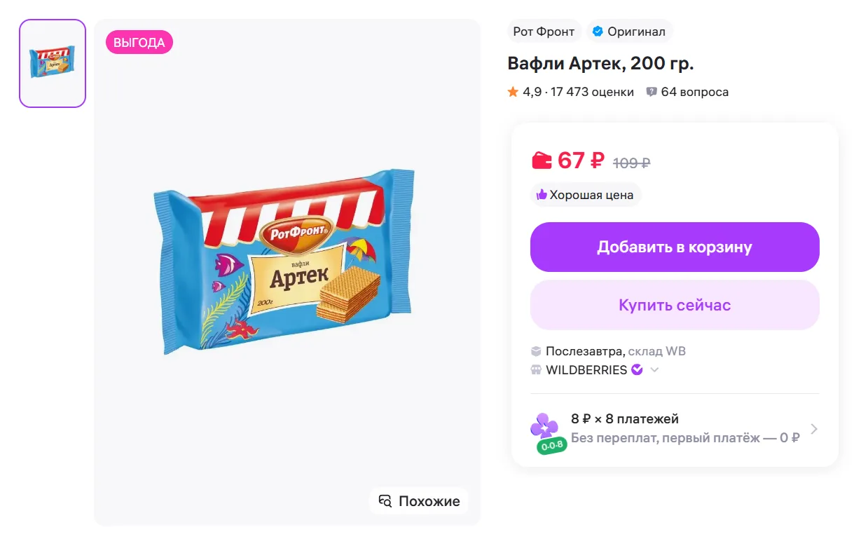 Вафли Артек РОТ ФРОНТ, 200 гр. за 67₽ - https://www.wildberries.ru/catalog/87054072/detail.aspx