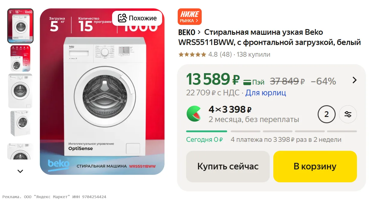 Стиральная машина узкая Beko WRS5511BWW, с фронтальной загрузкой, белый за 13589₽ на Яндекс Маркет - https://shp.pub/7bp5wc?erid=2SDnjdD7aKb