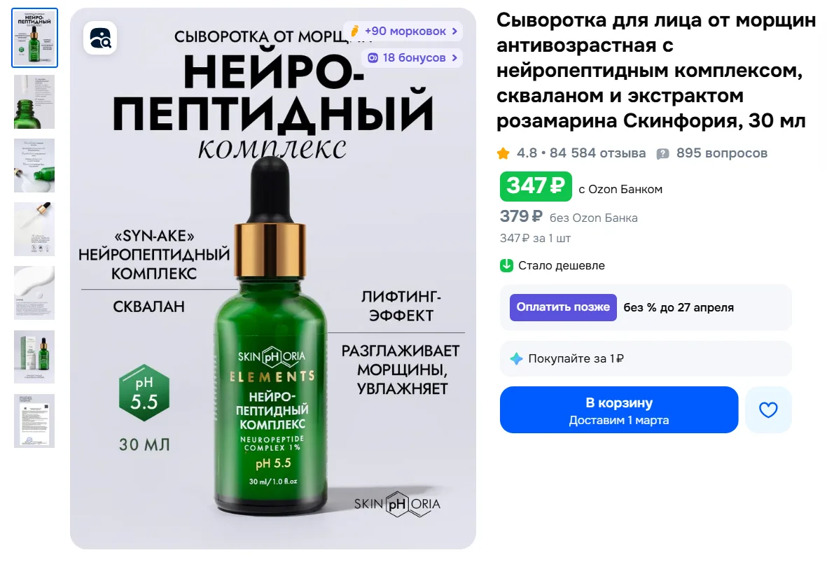 Сыворотка для лица от морщин антивозрастная с нейропептидным комплексом, скваланом и экстрактом розамарина Скинфория, 30 мл за 347₽ с Ozon Банком - https://ozon.ru/t/3hwMMoR
