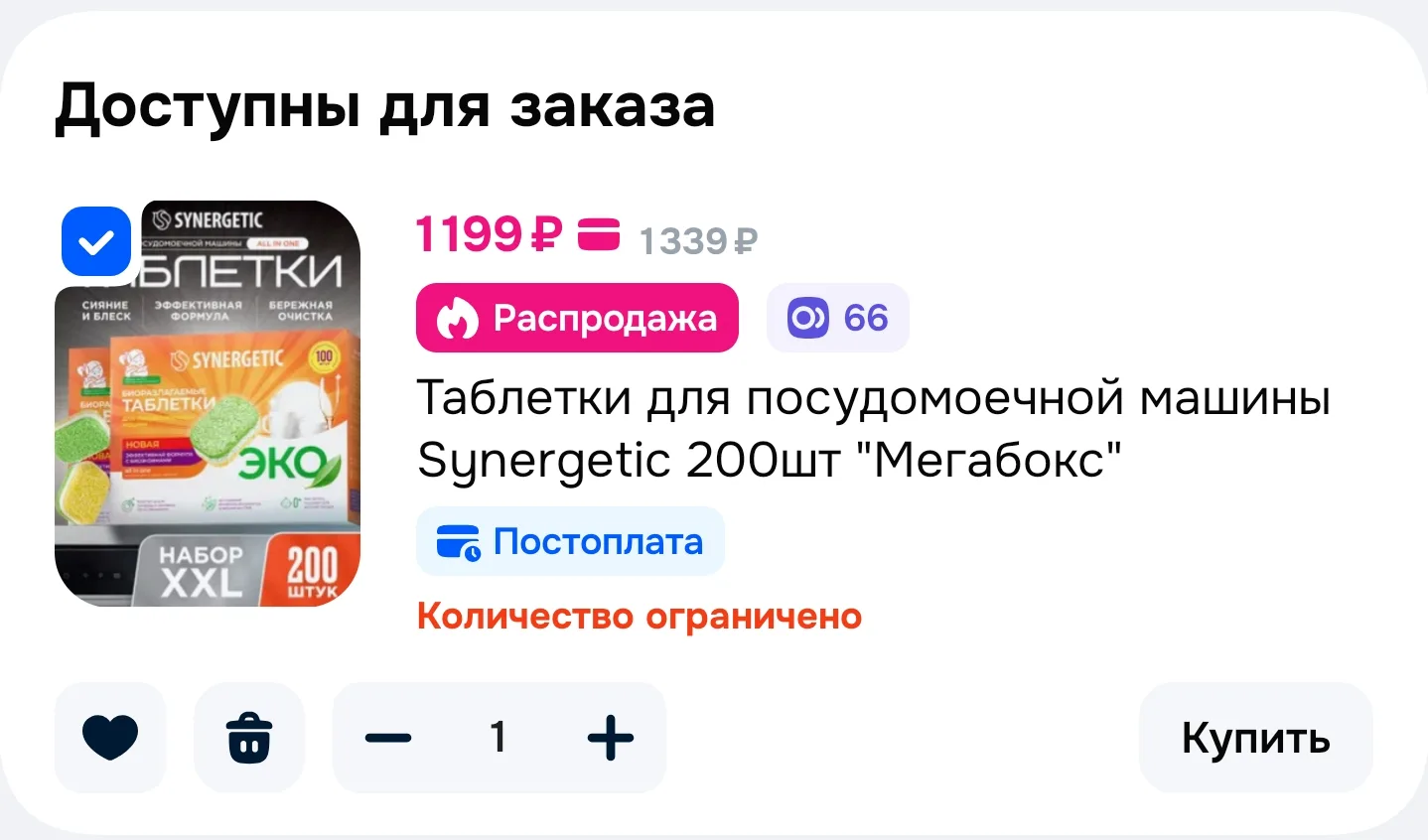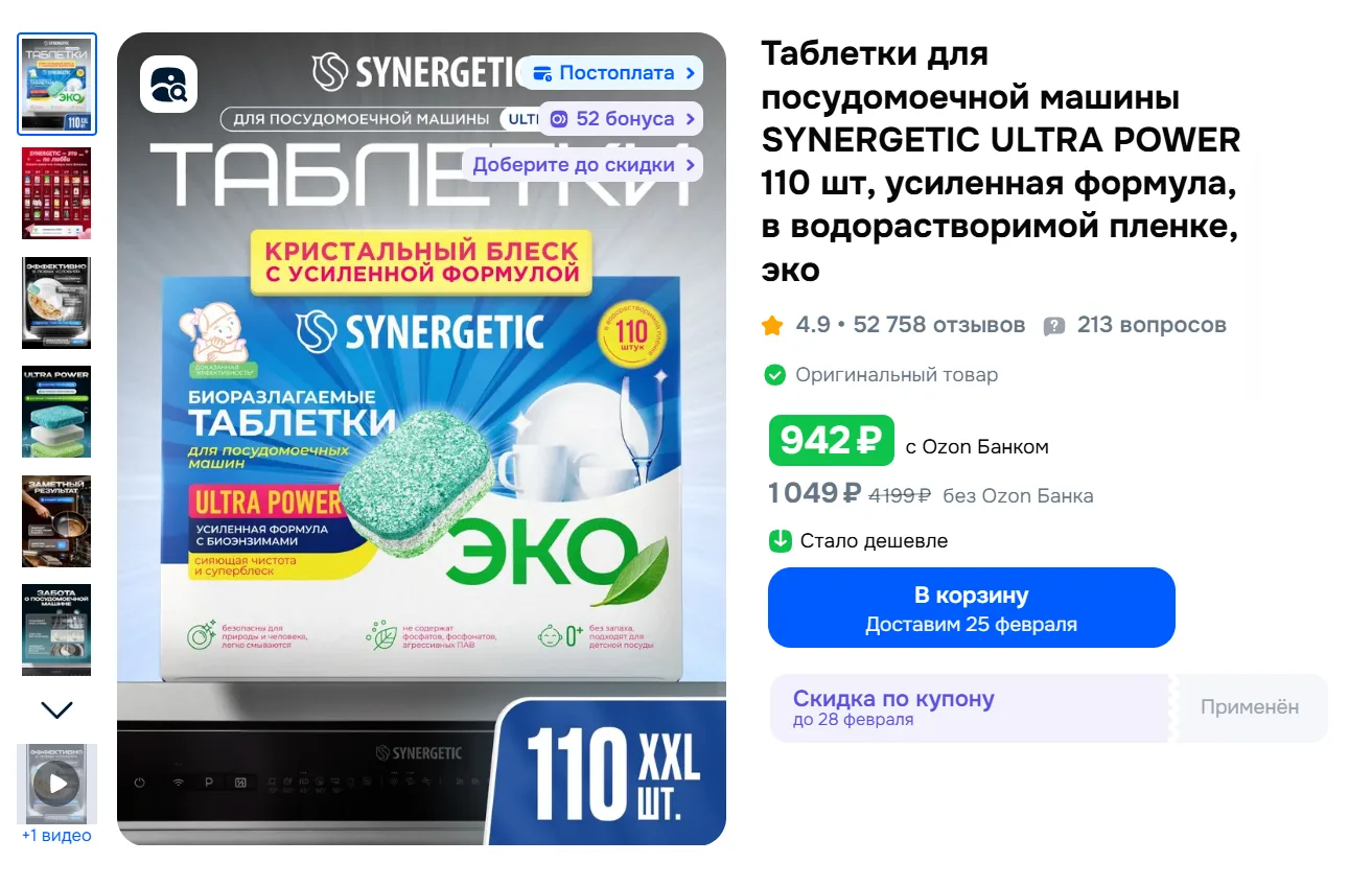 Цена меняется в корзине❗️Таблетки для посудомоечной машины Synergetic 200шт "Мегабокс" за 1199₽ c Ozon Банком - https://ozon.ru/t/Vamwgho
