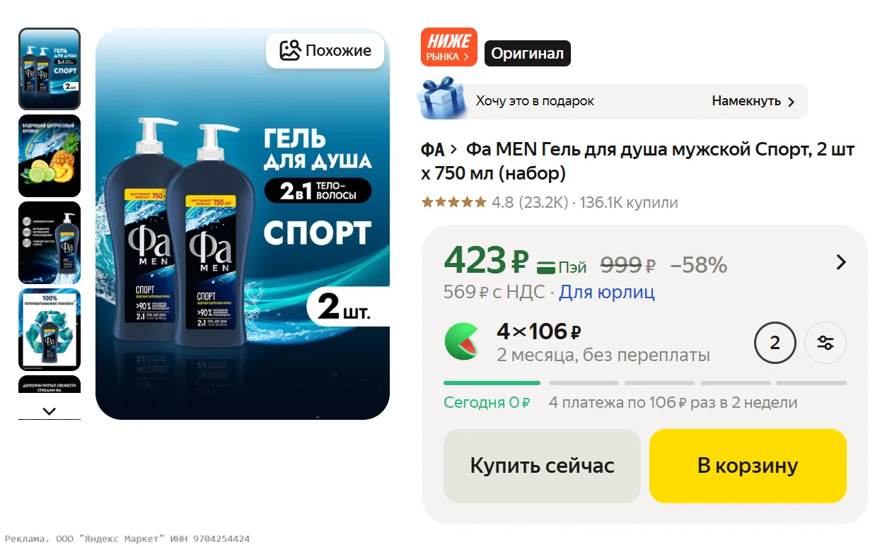 Фа MEN Гель для душа мужской Спорт, 2 шт х 750 мл (набор) за 423₽ на Яндекс Маркет - https://shp.pub/7bp743?erid=2SDnjeABD5s