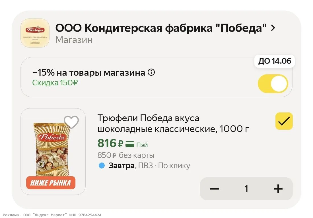 POBEDA15 - https://shp.pub/7bmnv5?erid=2SDnjdpxXkC - доп скидка 15% на кондитерские изделия Победа вкуса