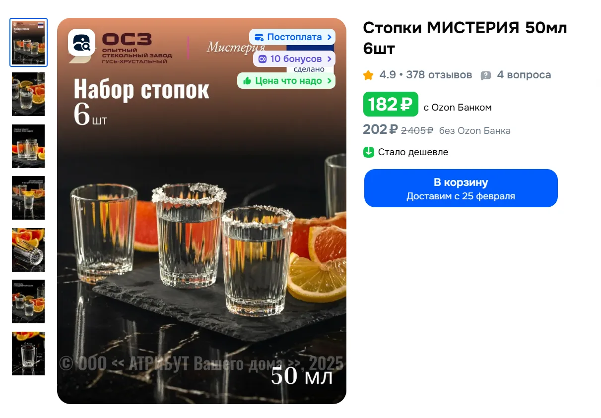 Стопки МИСТЕРИЯ 50мл 6шт за 182₽ с Ozon Банком - https://ozon.ru/t/HDLHK3K