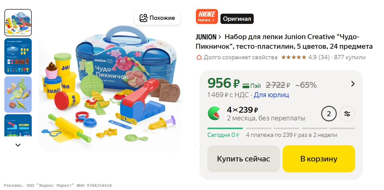 Набор для лепки Junion Creative "Чудо-Пикничок", тесто-пластилин, 5 цветов, 24 предмета за 956₽ на Яндекс Маркет - https://shp.pub/7bp6m7?erid=2SDnjdKAaZX