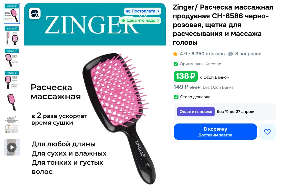 Zinger/ Расческа массажная продувная CH-8586 черно-розовая, щетка для расчесывания и массажа головы за 138₽ с Ozon Банком - https://ozon.ru/t/HDLF9ZR