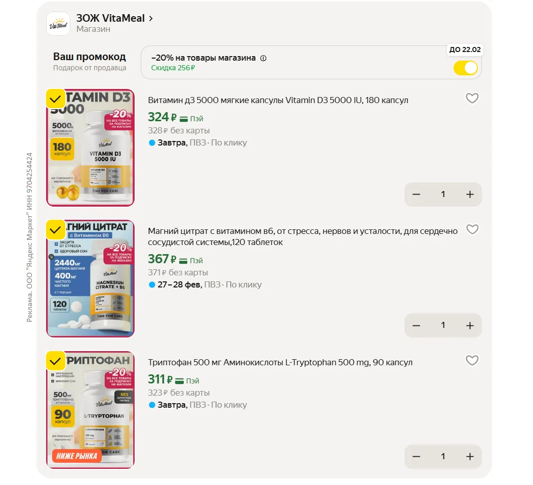 Доп скидка 20% на витамины и пищевые добавки VitaMeal на Яндекс Маркет