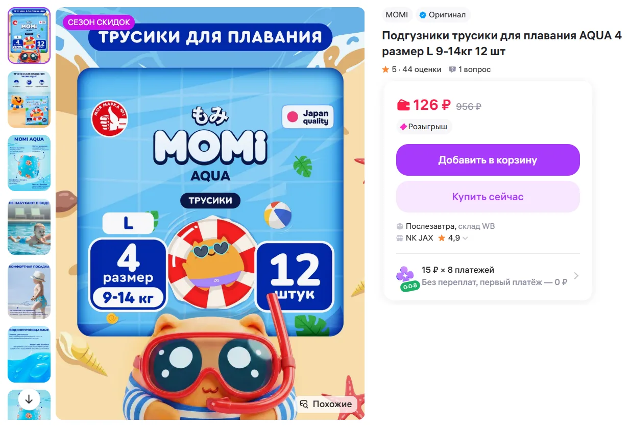 Подгузники трусики для плавания AQUA 4 размер L 9-14кг 12 шт за 126₽ - https://www.wildberries.ru/catalog/706139291/detail.aspx