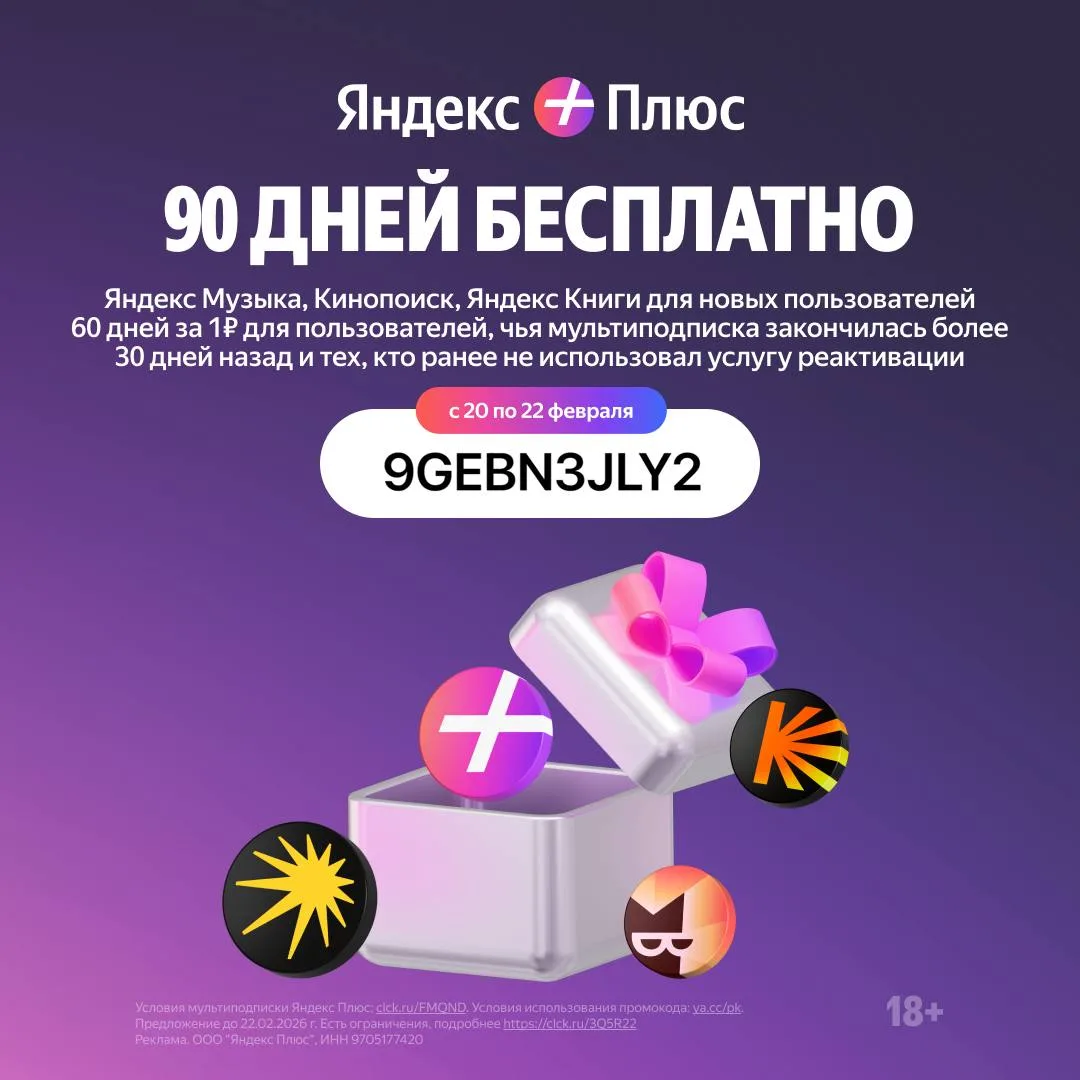- 90 дней доступа к Яндекс Плюс бесплатно для новых пользователей или 60 дней за 1 ₽ ДЛЯ ВСЕХ, кто не пользовался сервисом более 30 дней и ранее не использовал услугу реактивации за 1₽