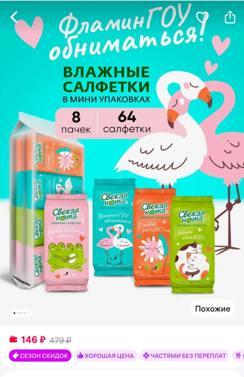 🟪 СВЕЖАЯ НОТА Влажные салфетки мини карманные Ми-Ми-Ми 8 уп х 8шт