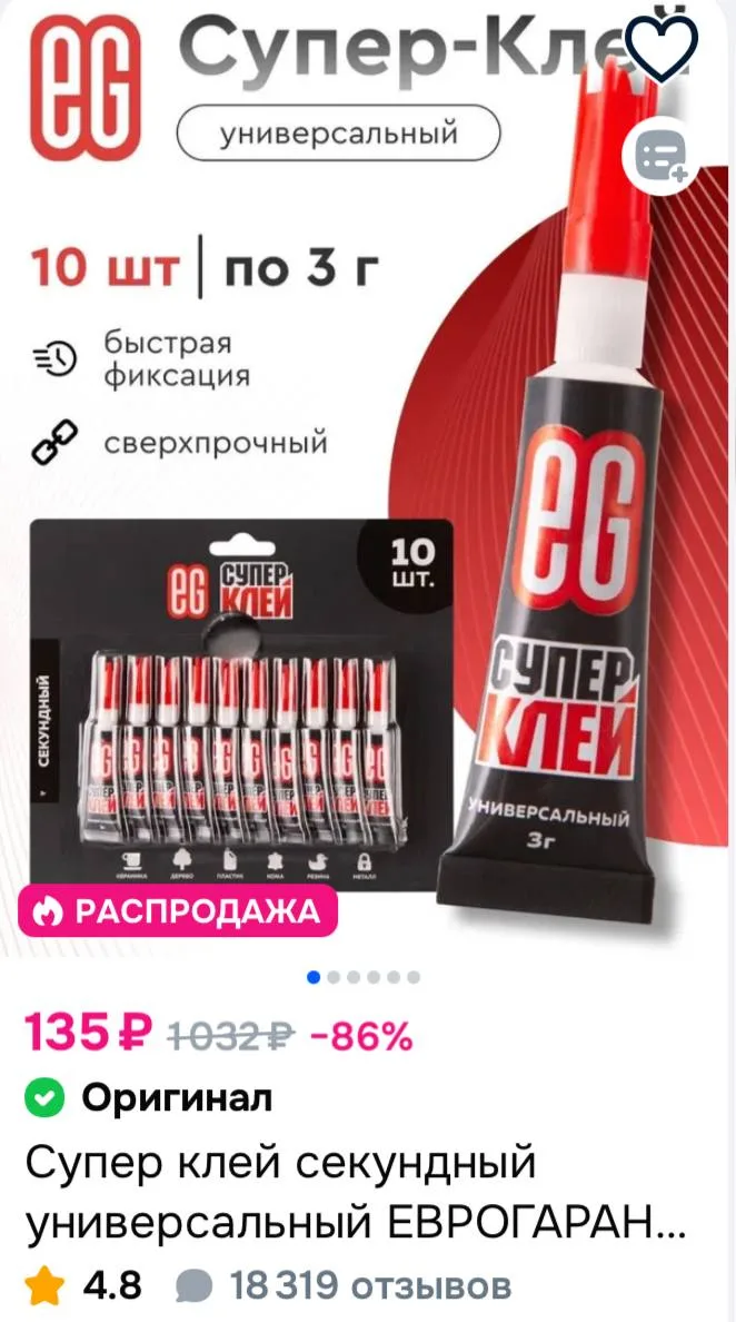 Супер клей секундный универсальный ЕВРОГАРАНТ блистер 10 штук