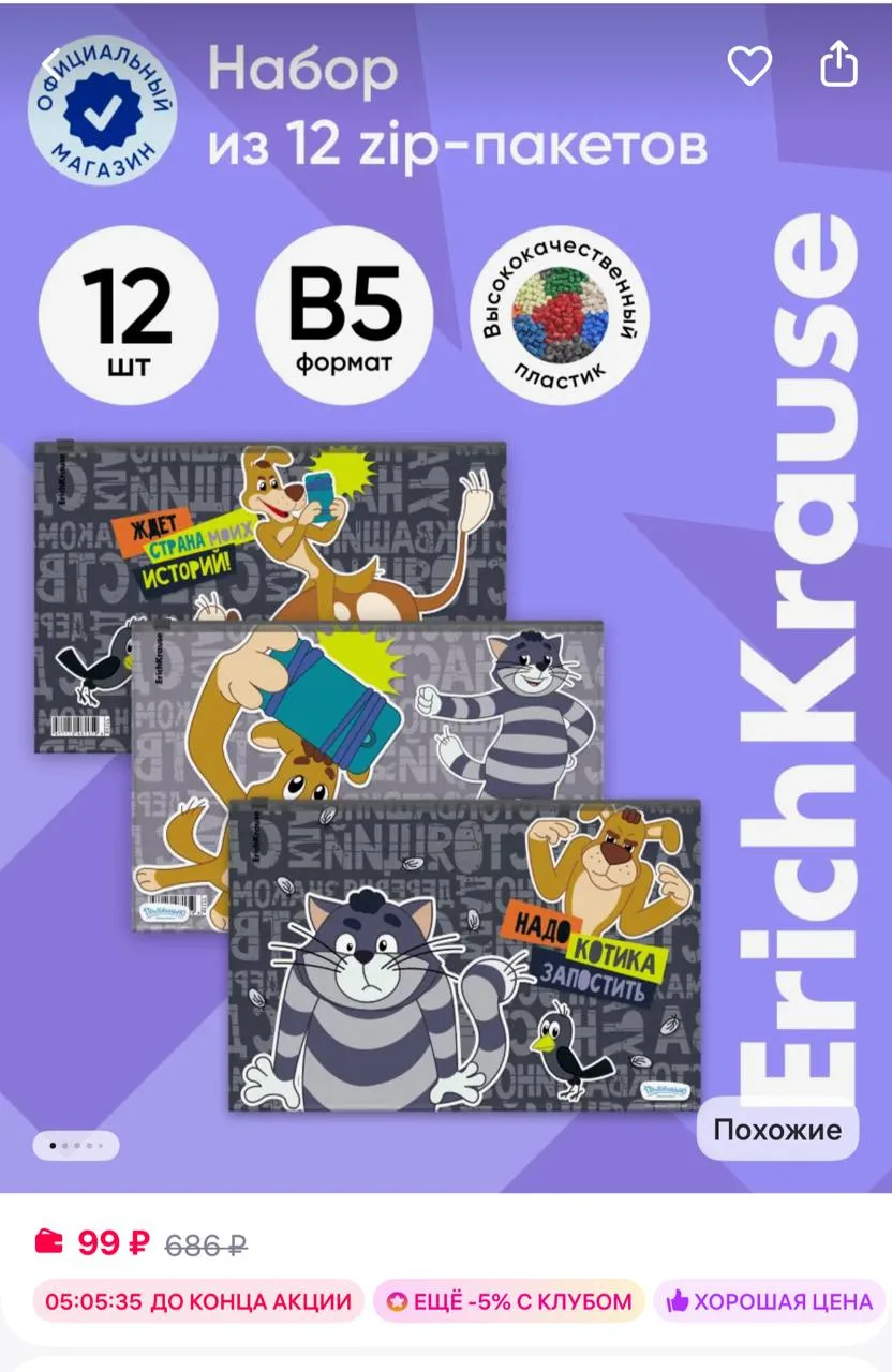 🟪ErichKrause Папка-конверт на ZIP-молнии B5, 12шт