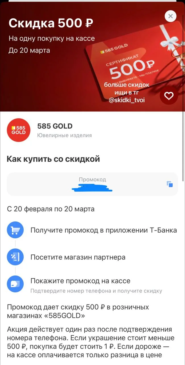 Проверяйте у себя скидку 500₽ в 585Gold без минимальной суммы покупки