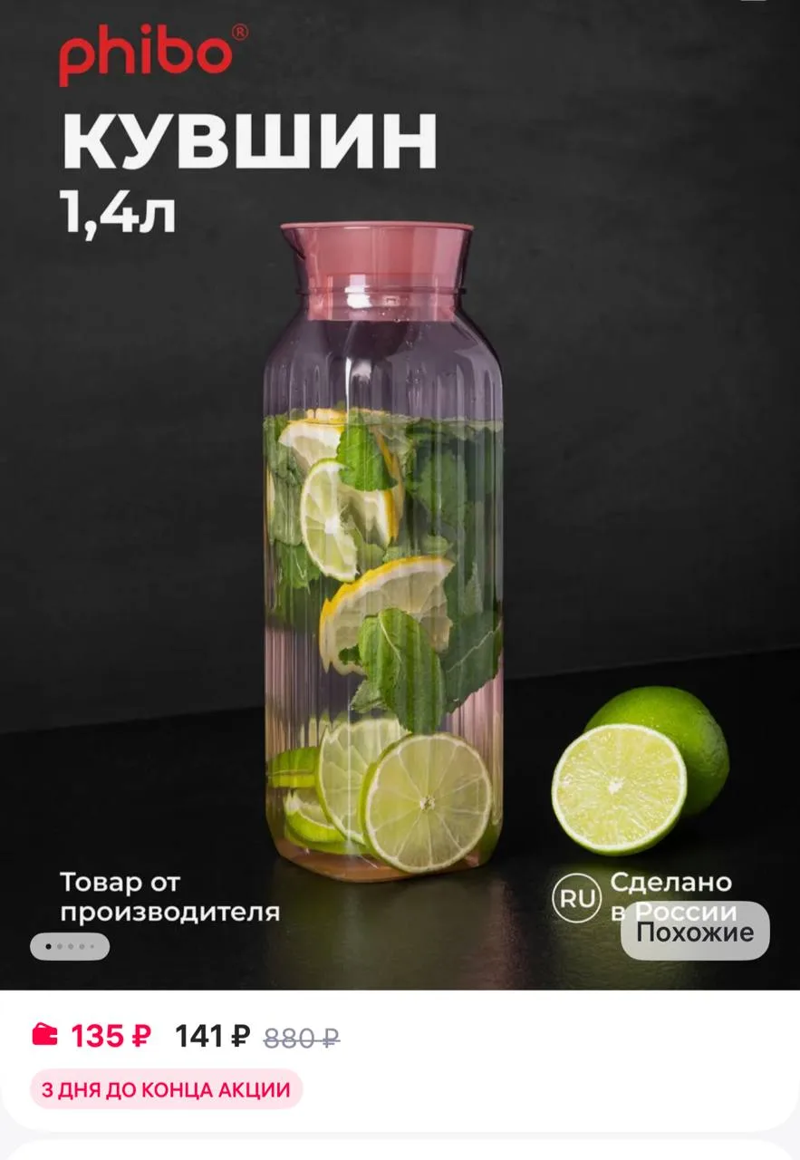🟪Phibo Кувшин с крышкой для воды пластиковый 1,4л