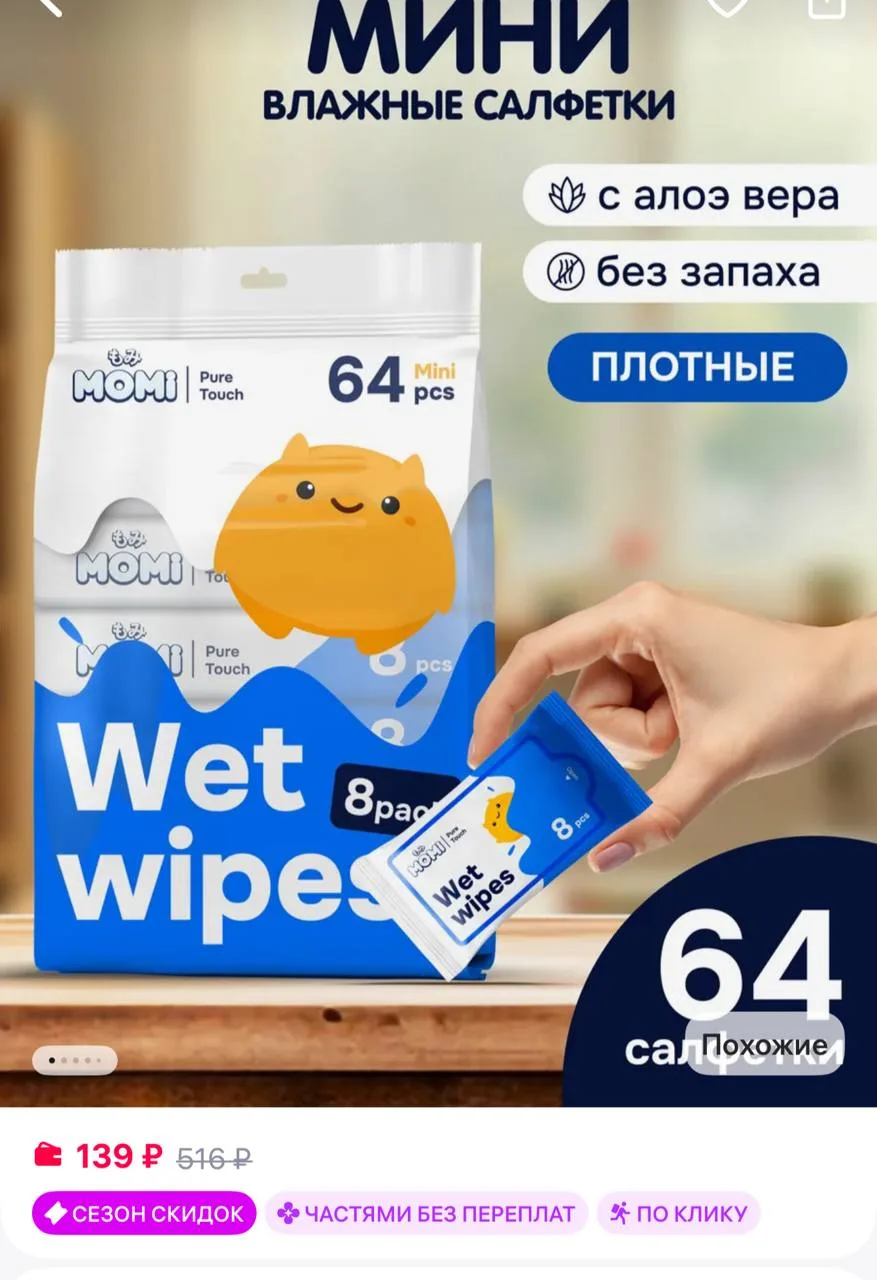 🟪 MOMI Детские влажные салфетки "Mini" 0+ ультрамягкие, 8шт*8 уп