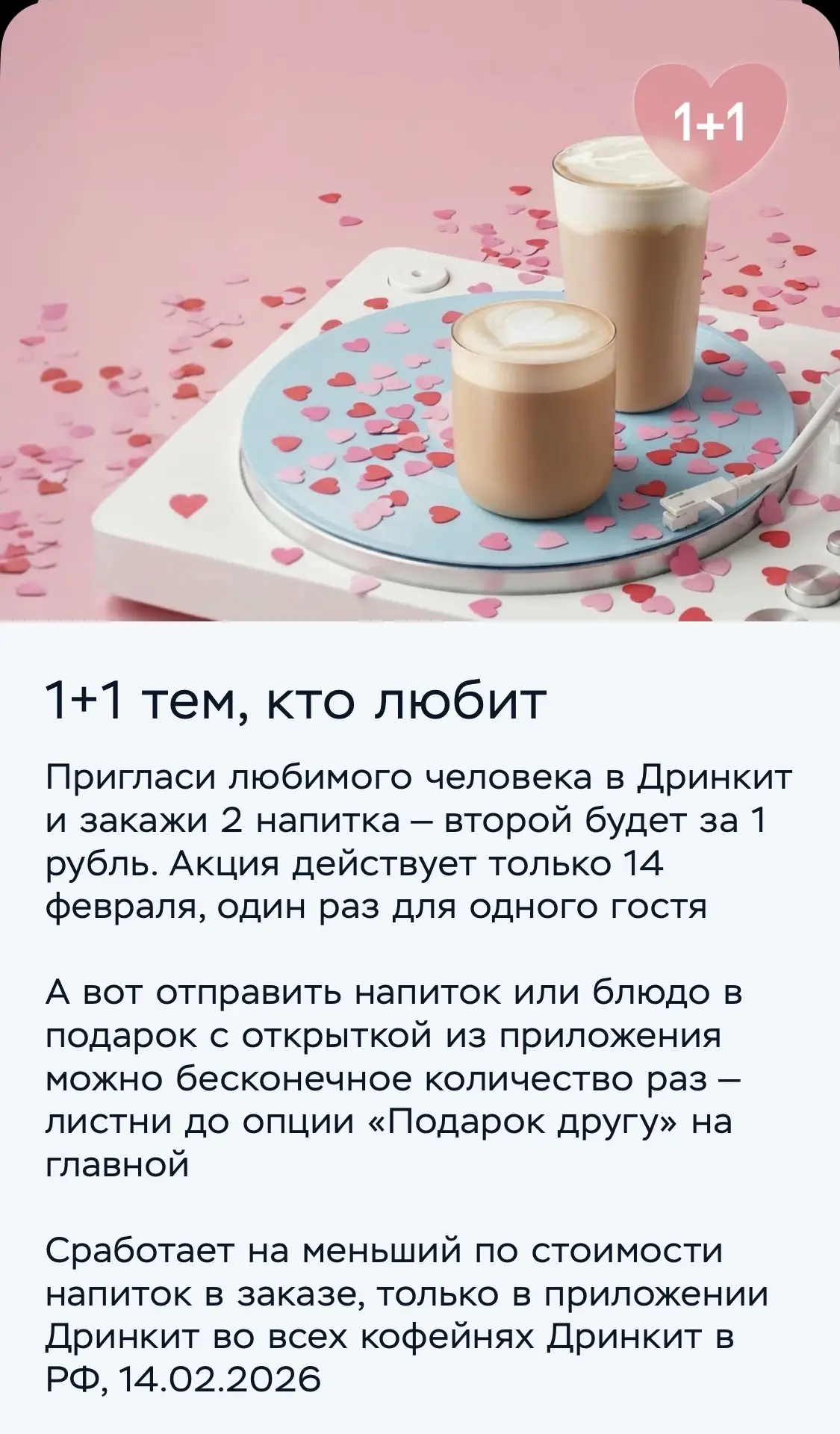 ☕️Дринкит кофейня (сетевая) в честь дня всех влюбленных 1+1 на все напитки!