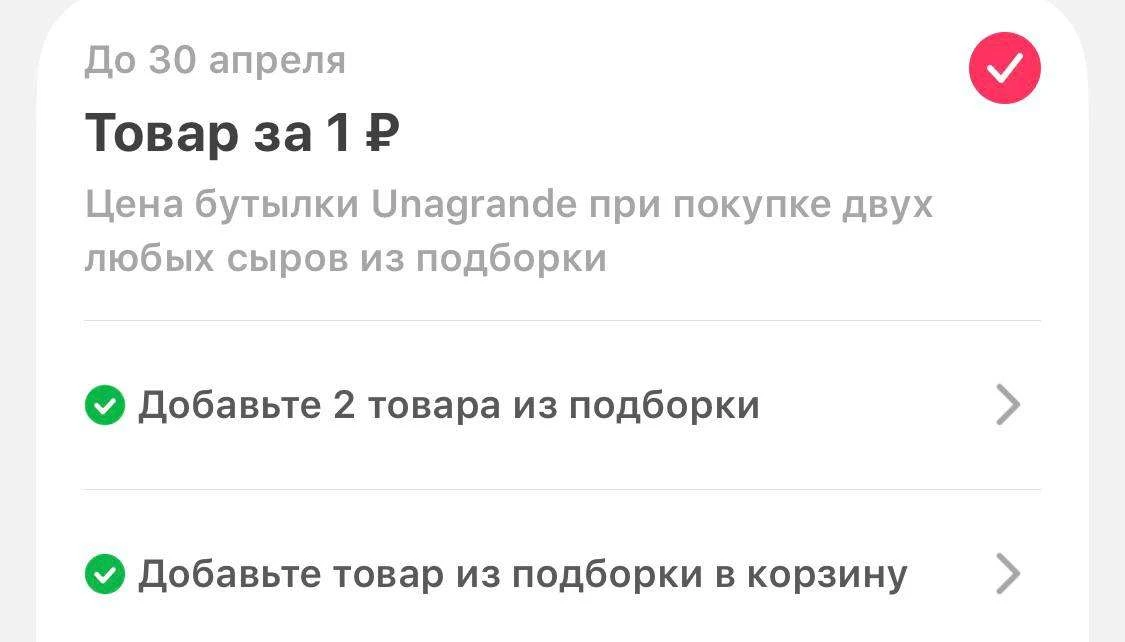 Положите любой товар в корзину, нажмите "скидки и промокоды", надо найти акцию "товар за 1р" , добавить товары из подборки на 1000₽ нажать применить.