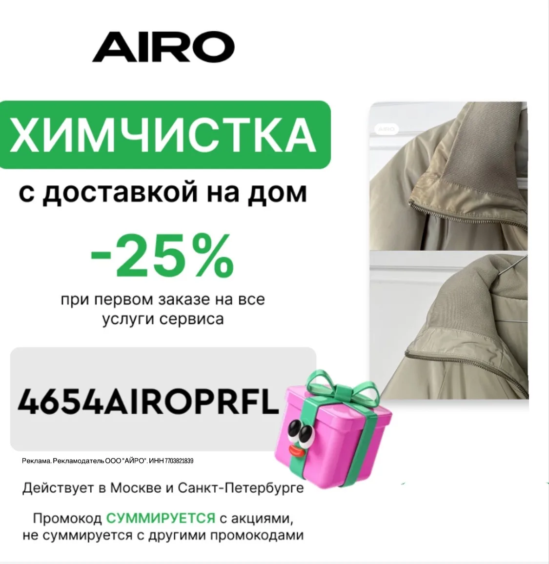 промокод: 4654AIROPRFL – Скидка 25% при первом заказе любых услуг сервиса + бесплатная доставка при заказе химчистки одежды и обуви.*