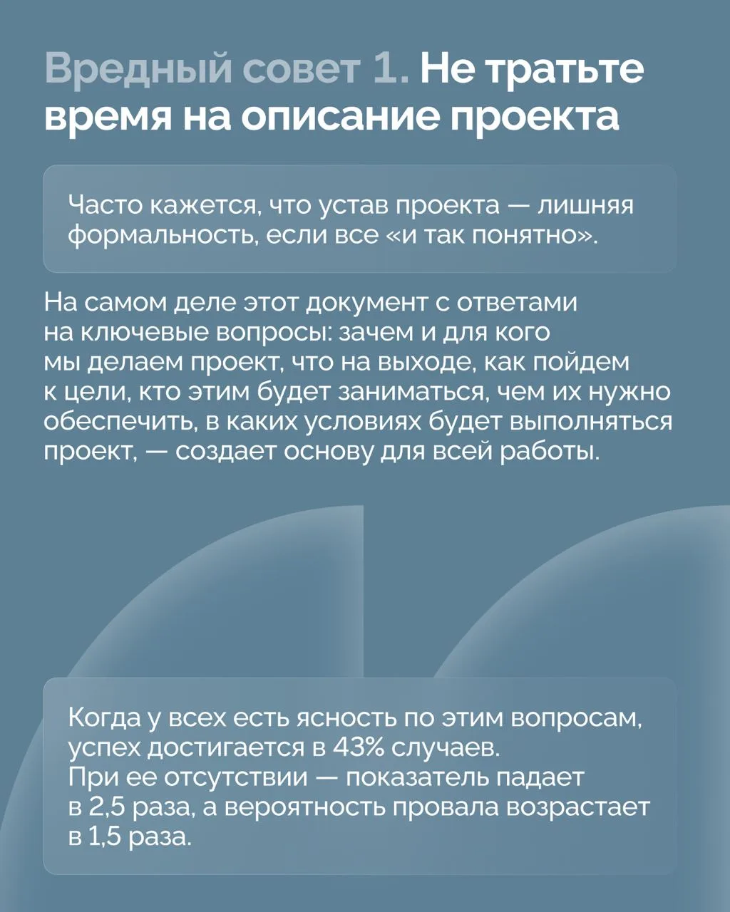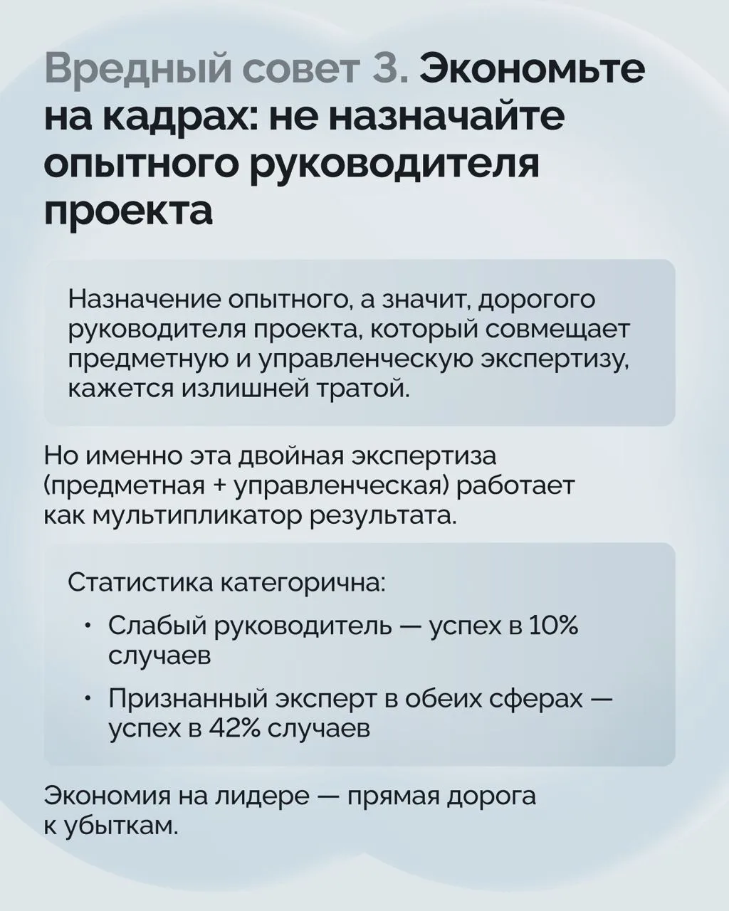 На основе анализа 385 реальных кейсов разбираем самые частые ошибки, которые ведут к провалу, — в карточках с Павлом Алферовым, профессором бизнес-практики Школы управления СКОЛКОВО, автором программы «Управление проектами: как правильно делать правильные вещи».