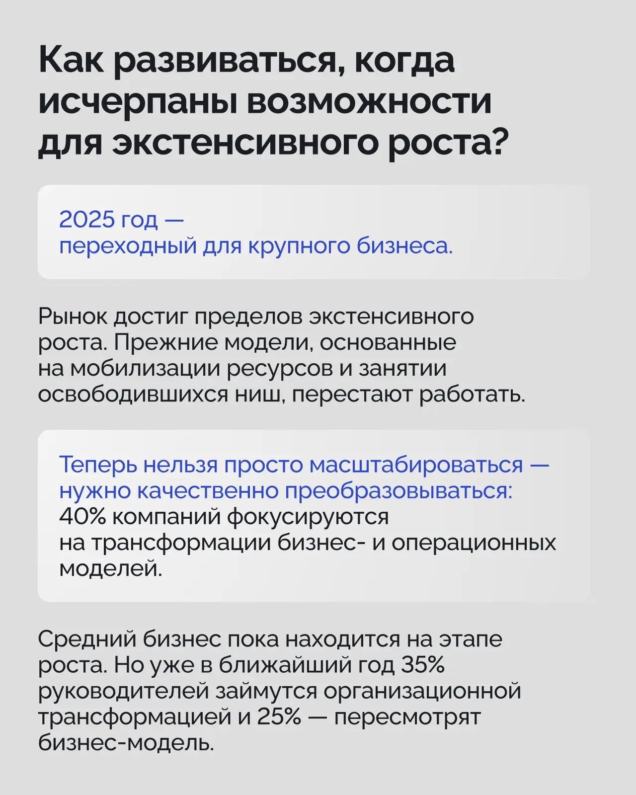Это хорошая точка в развитии. Она открывает возможность качественно перестроить организацию. Те, кто этим шансом воспользуется, выйдут из тупика на новую скоростную трассу».