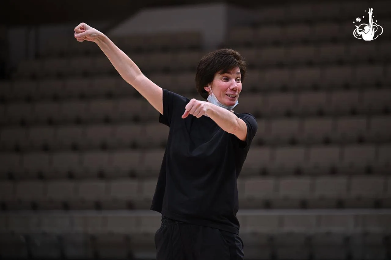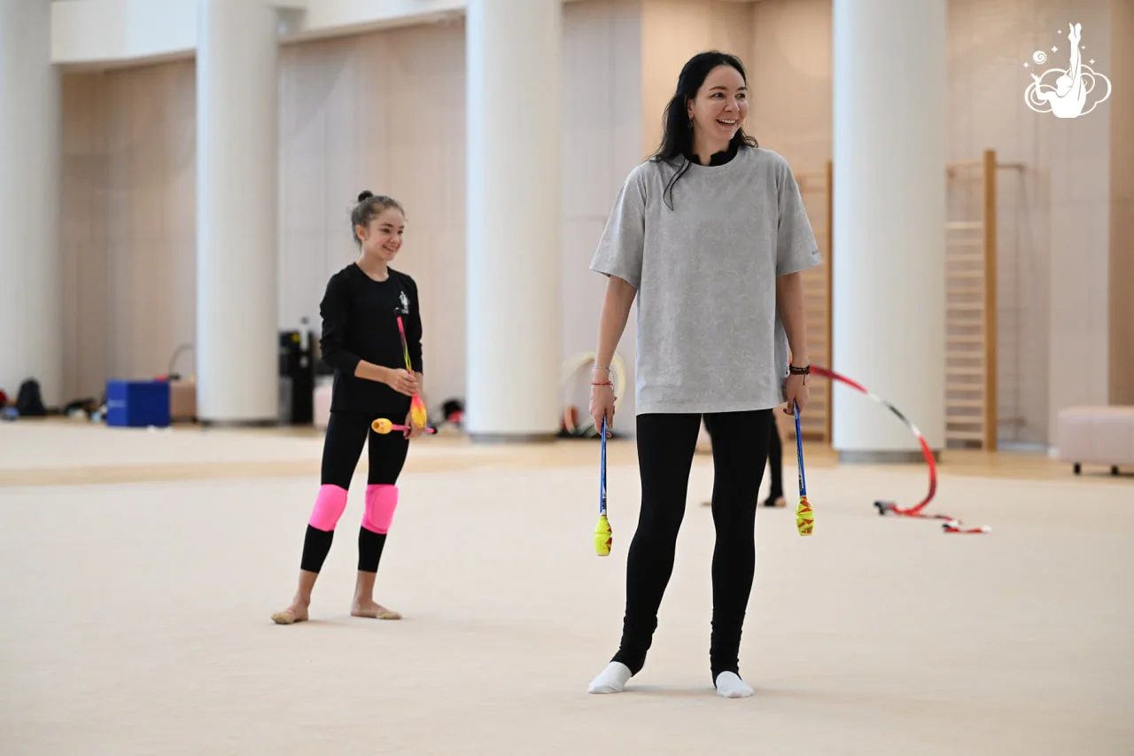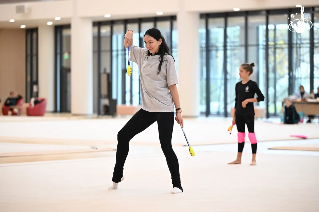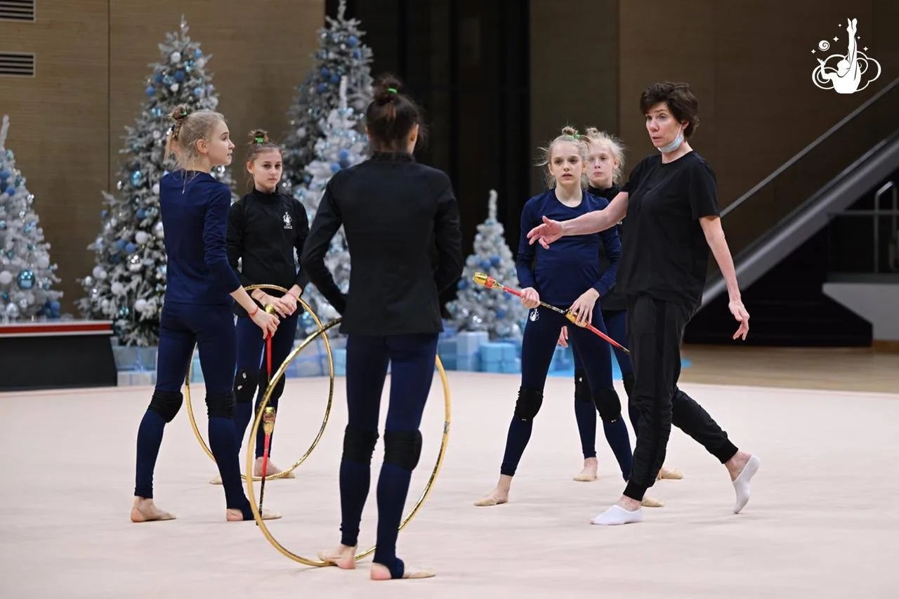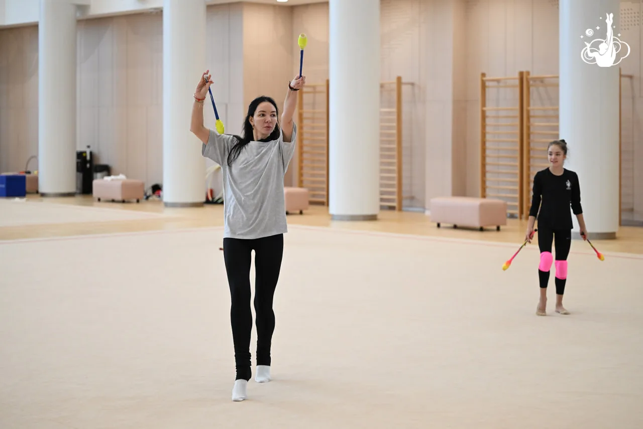 Хореограф Наталья Белугина приехала в Академию и уже приступила к постановке нового упражнения с булавами для Ксении Савиновой из Гатчины.