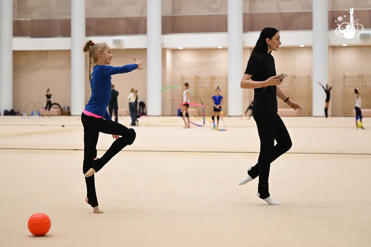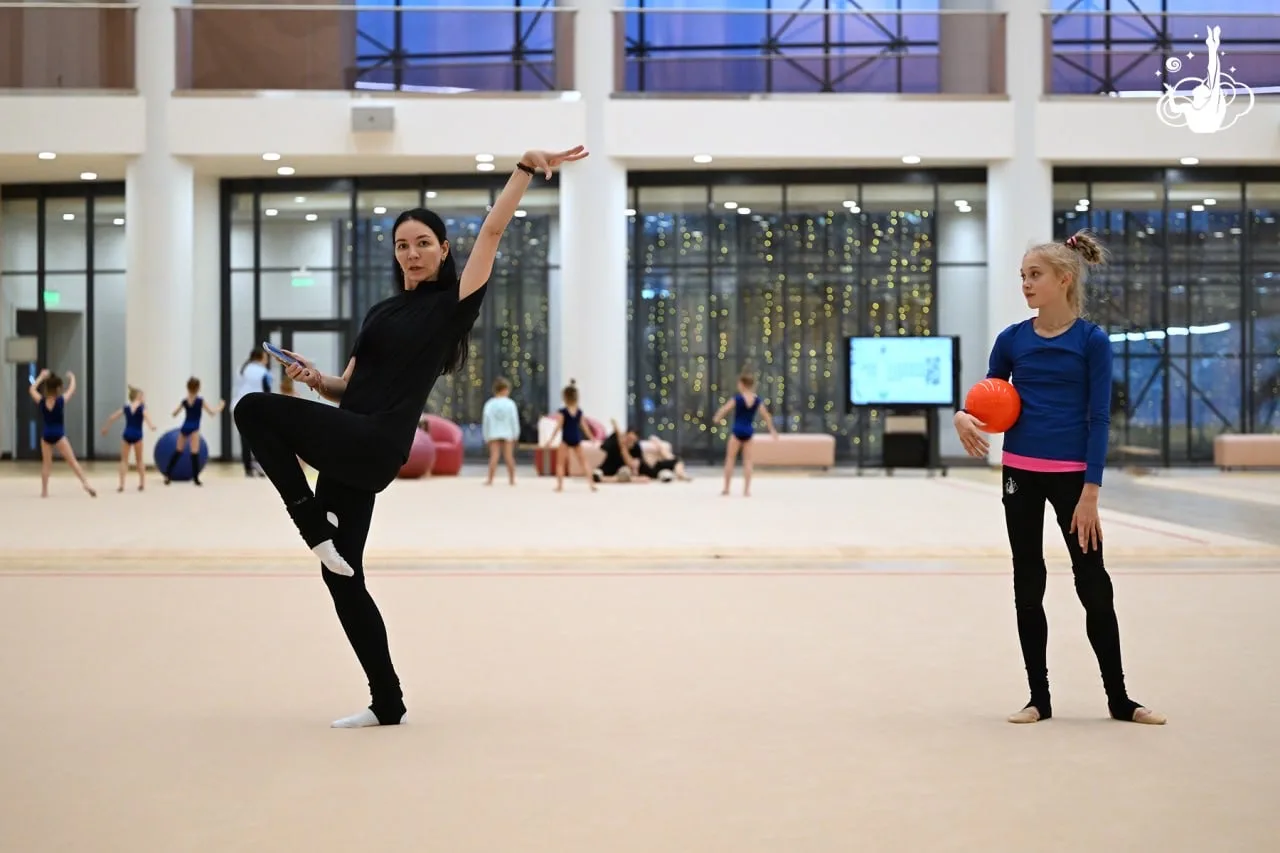 На занятии гимнастка из Тюменской области отрабатывала вставание в танцевальной дорожке. Советы олимпийской чемпионки помогли сделать движение выразительнее и амплитуднее.