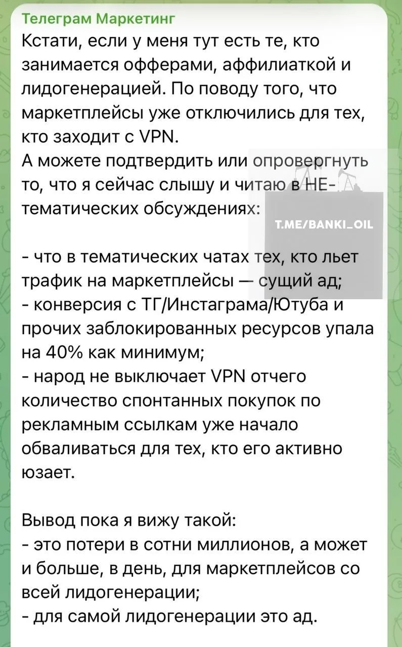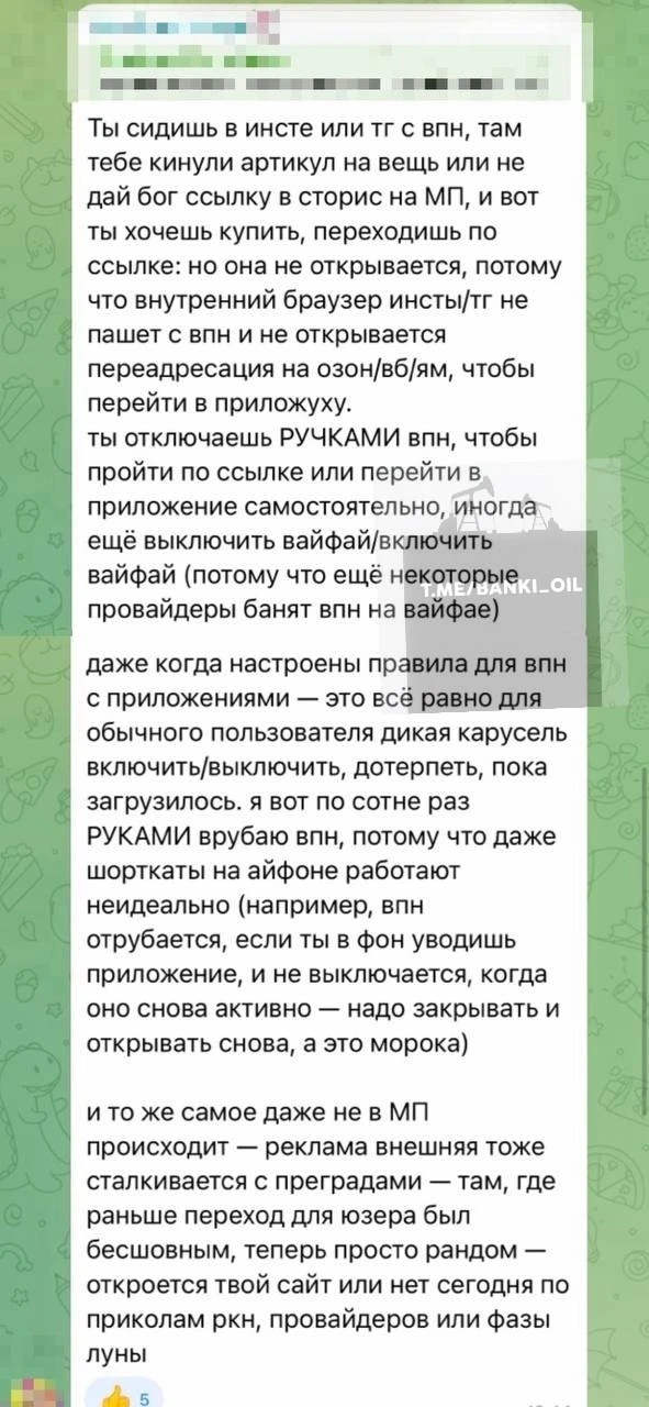 Экономика маркетплейсов рушится из-за требования отключать VPN. По словам участников рынка, в профильных чатах «сущий ад», а конверсия трафика из Telegram, Instagram* и YouTube просела минимум на 40%. Импульсные покупки практически исчезли — пользователи не доходят до корзины, лишнее действие ломает всю воронку.