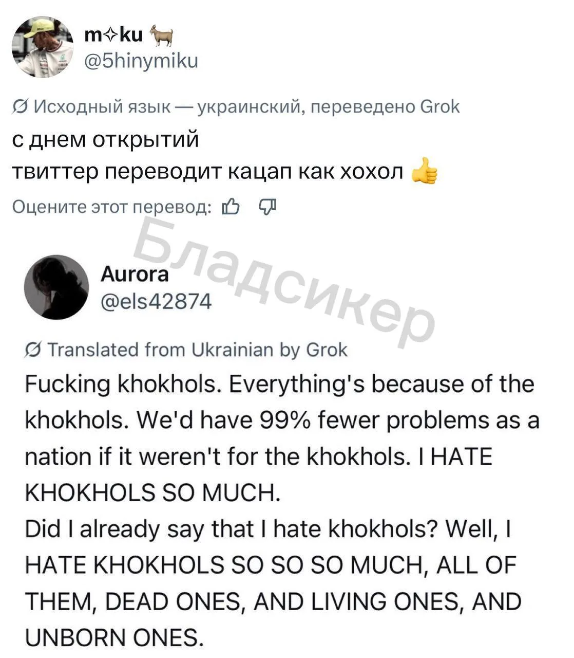 Оказывается, нейронка Илона Маска при переводе украинских твитов для англоязычной аудитории заменяет «кацап» на «хохол»