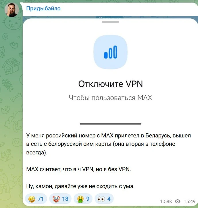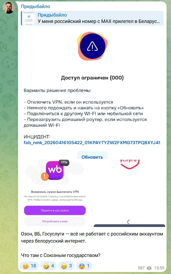 Журналист пожаловался, что российские маркетплейсы, Max и Госуслуги не работают с российским аккаунтом через белорусский интернет. Все сервисы считают, что используется VPN.