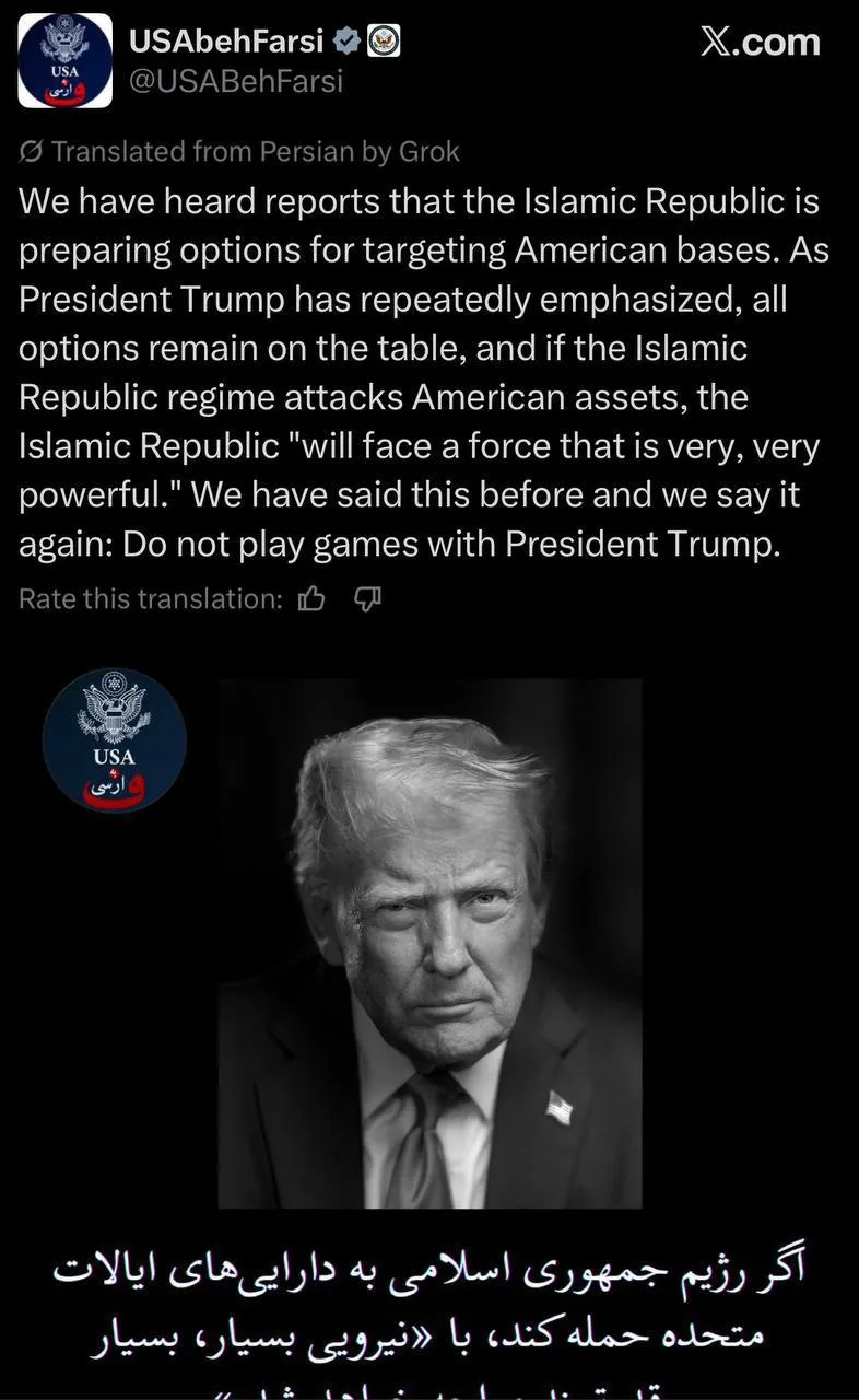Тем временем, официальная страница Государственного департамента США на персидском языке сообщает, что они получили сообщения, указывающие на то, что "Исламская Республика готовит варианты для нанесения ударов по американским базам".