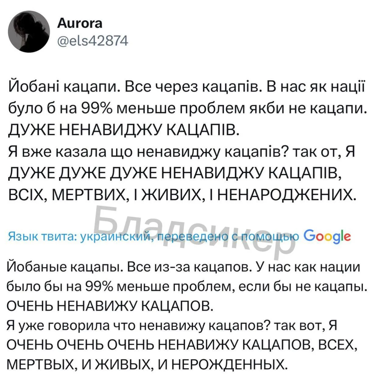 Например твит «Ебаные кацапы. Все из-за кацапов. У нас было бы на 99% меньше проблем, если бы не кацапы. Я ТАК НЕНАВИЖУ КАЦАПОВ» для англоязычной аудитории выглядит так: «Ебаные хохлы. Все из-за хохлов. У нас было бы на 99% меньше проблем, если бы не хохлы. Я ТАК НЕНАВИЖУ ХОХЛОВ»