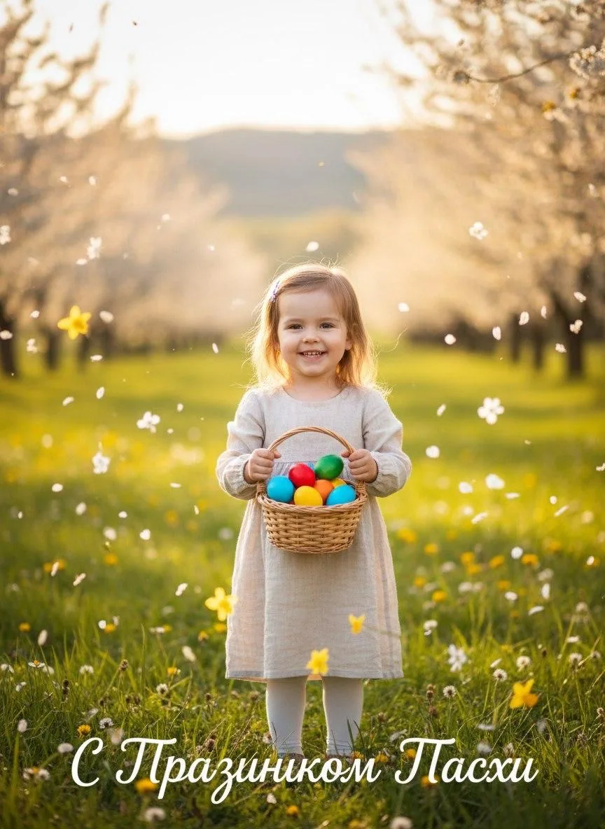 Надпись внизу открытки: «С Праздником Пасхи». Маленькая девочка в светлом льняном платье стоит на зеленой лужайке. В руках у нее небольшая плетеная корзинка, полная ярких цветных яиц. Вокруг летают лепестки цветов. Солнечный день, легкое размытие фона, улыбка на лице ребенка. Стиль: фотореализм, весенняя атмосфера, естественное освещение, теплые тона