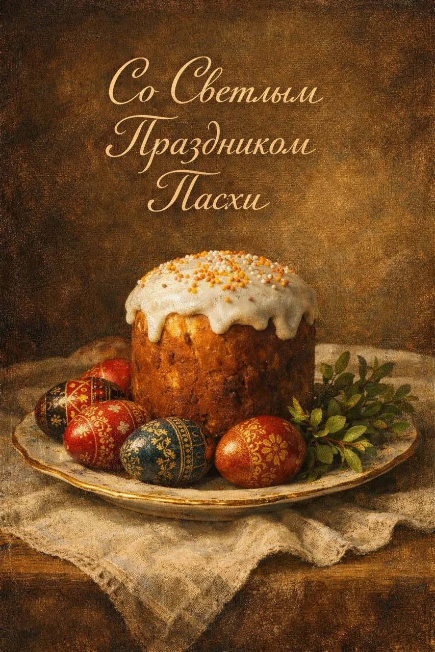 Надпись элегантным шрифтом в центре: «Со Светлым Праздником Пасхи». Фарфоровая тарелка с аппетитным куличом в белой глазури, рядом - расписные писанки и веточки зелени. На столе льняная скатерть, приглушенное освещение. Стиль: фотореализм, натюрморт в стиле старой живописи, теплые охристые тона, глубокая резкость, текстура холста