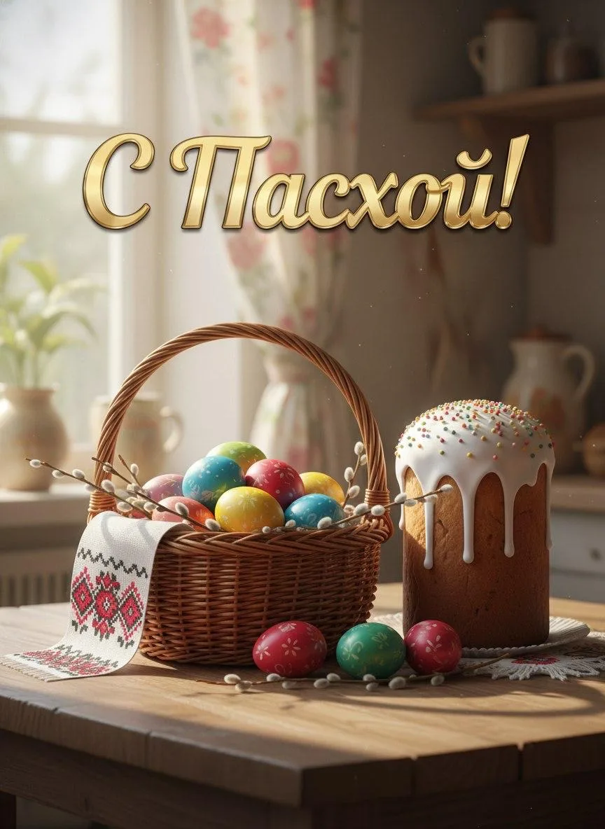 Надпись крупными золотистыми буквами в центре: «С Пасхой!». На переднем плане - плетеная корзина с разноцветными крашеными яйцами, пушистыми веточками вербы и белым льняным рушником. Рядом стоит высокий кулич с сахарной глазурью и посыпкой. Мягкий утренний свет из окна, легкие тени. Стиль: фотореализм, уютная домашняя атмосфера, пастельные тона, высокая детализация