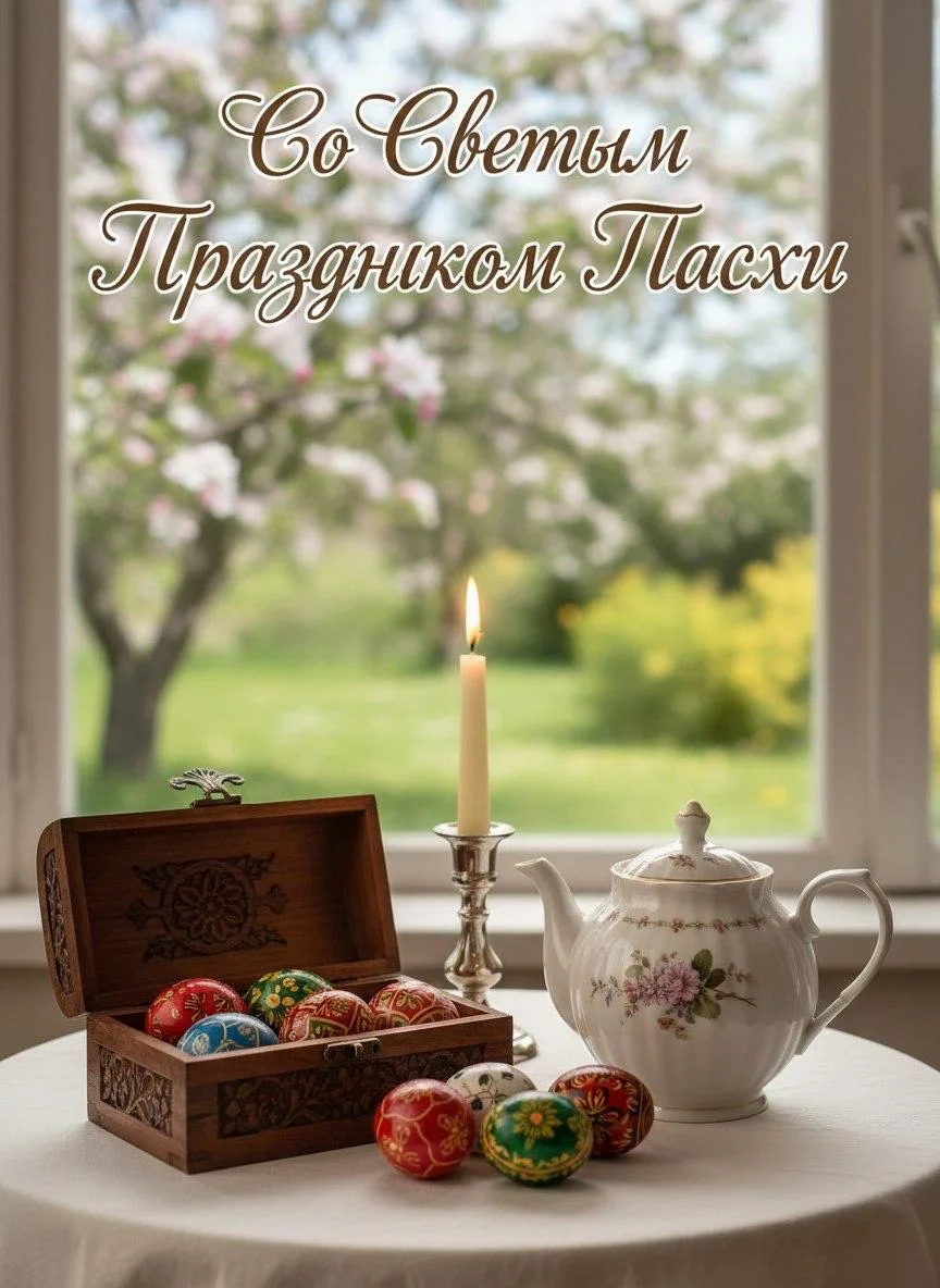 Элегантная надпись в верхней части: «Со Светлым Праздником Пасхи». На столе - фарфоровый чайник, расписные пасхальные яйца в резной деревянной шкатулке, тонкая свеча в подсвечнике. На заднем плане - размытый весенний сад за окном, цветущие яблони. Стиль: кинематографичный, нежные тона, мягкий боковой свет, глубина резкости